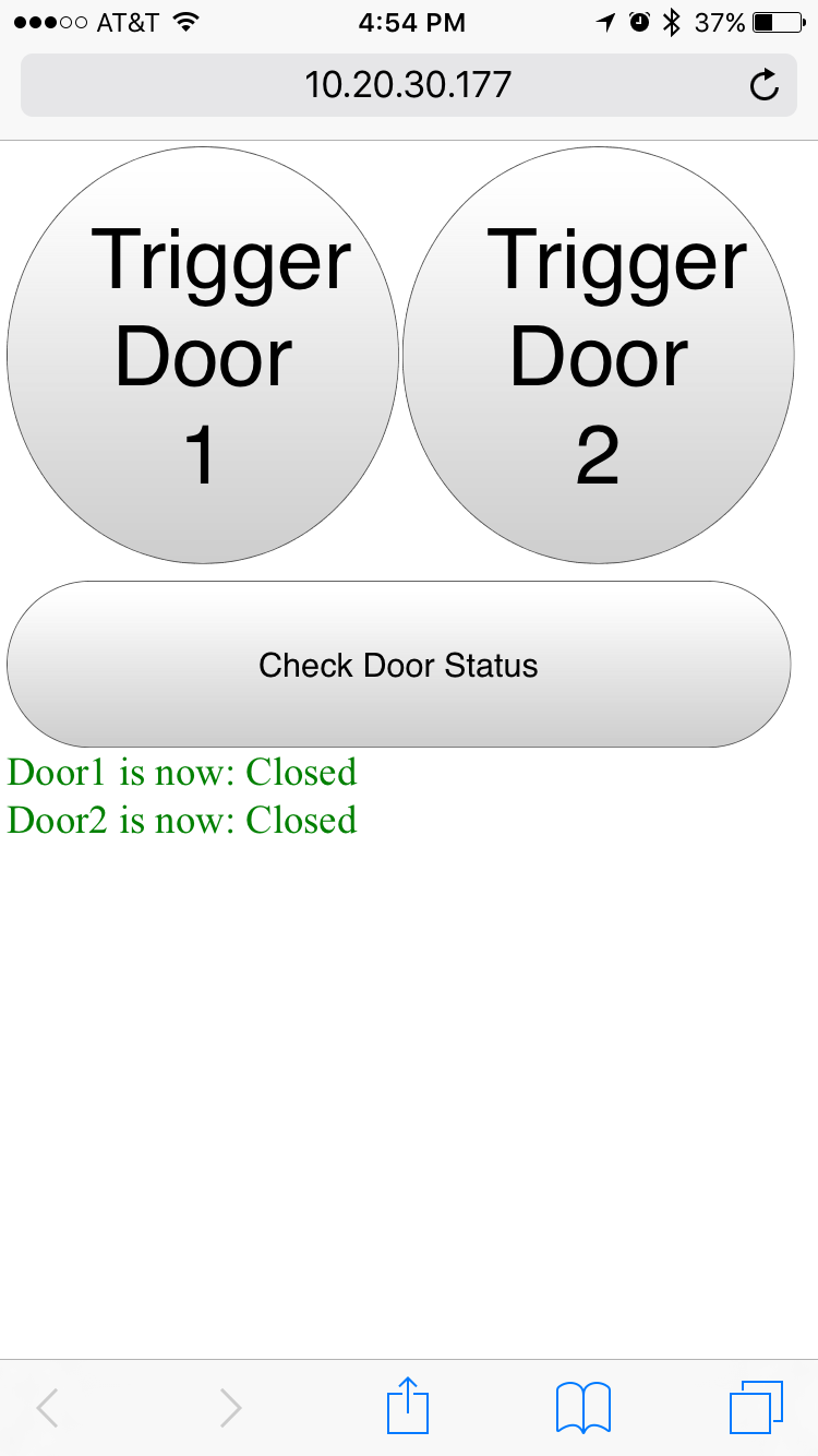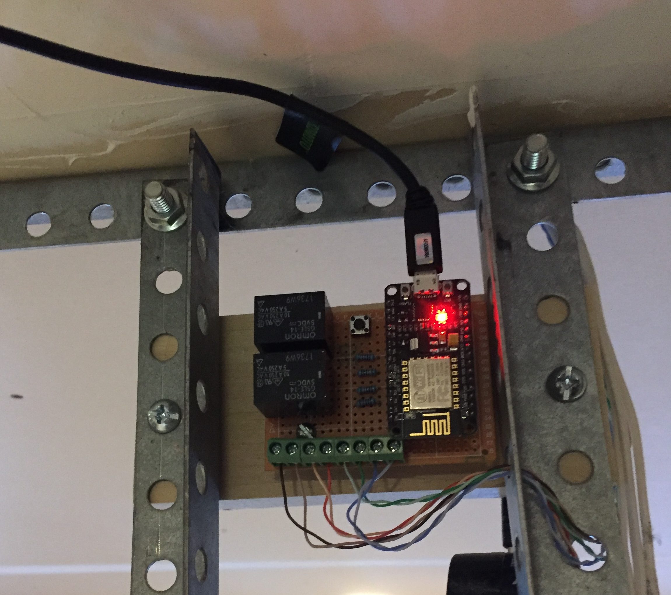 Since I finished the prototype this week I decided to actually install it in place of the breadboard version in the garage. I ended up coming up with a poor mans mounting system where I drilled two larger holes through the prototyping board, put nuts on the back, then used other nuts to keep the board slightly off of the wooden board I mounted the prototype to. Then I drilled two holes in the wooden board and mounted it on the brackets by the garage door opener. It looks much cleaner than the last install that’s for sure. I also updated the web page so the buttons would be larger and easier to use…
