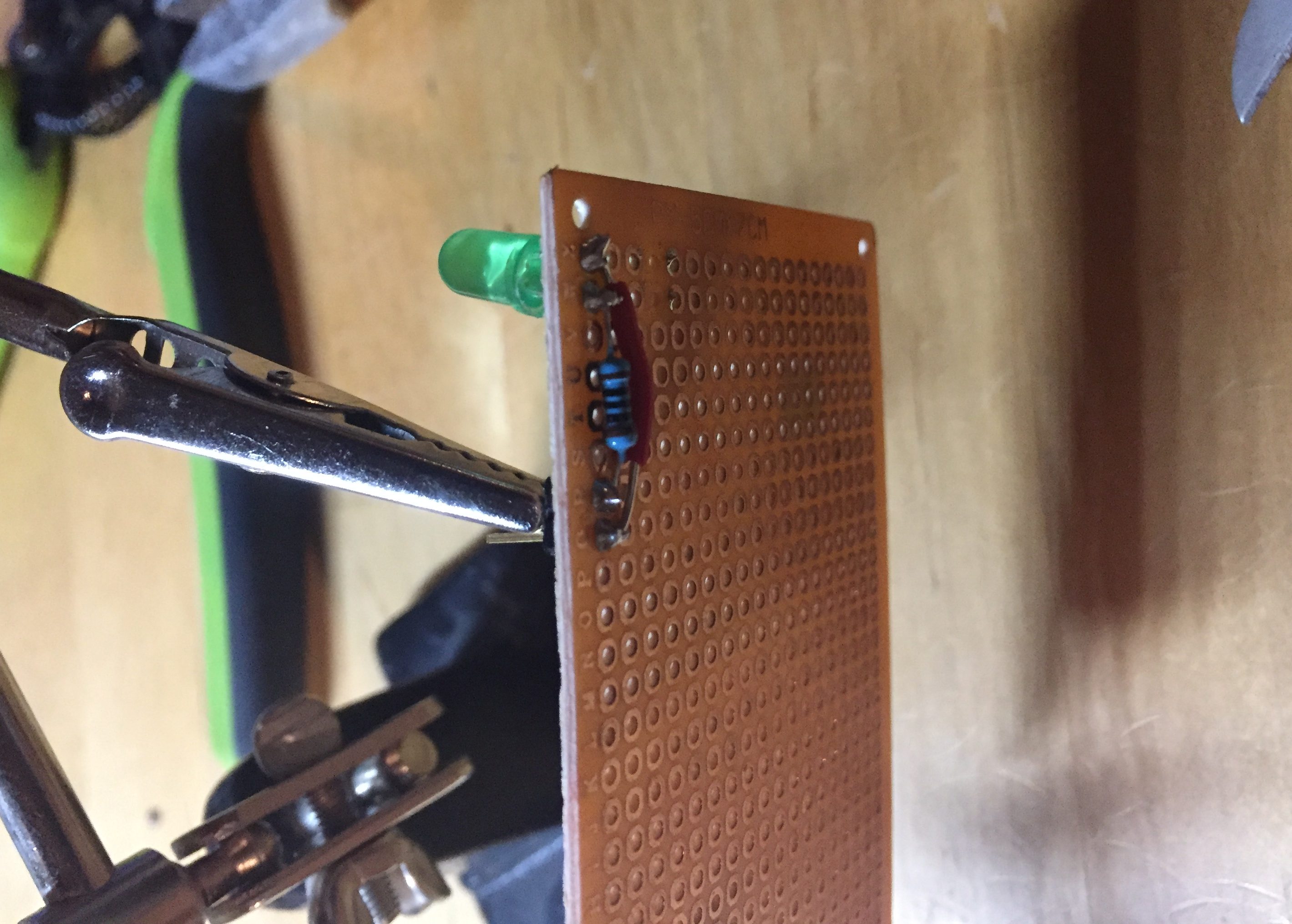 Sort of hard to see, but the gauge of the solid core wire was too thick to fit through the perfboard hole with the component. So I had to do my cross connects on the back of the board. In either case – it worked!