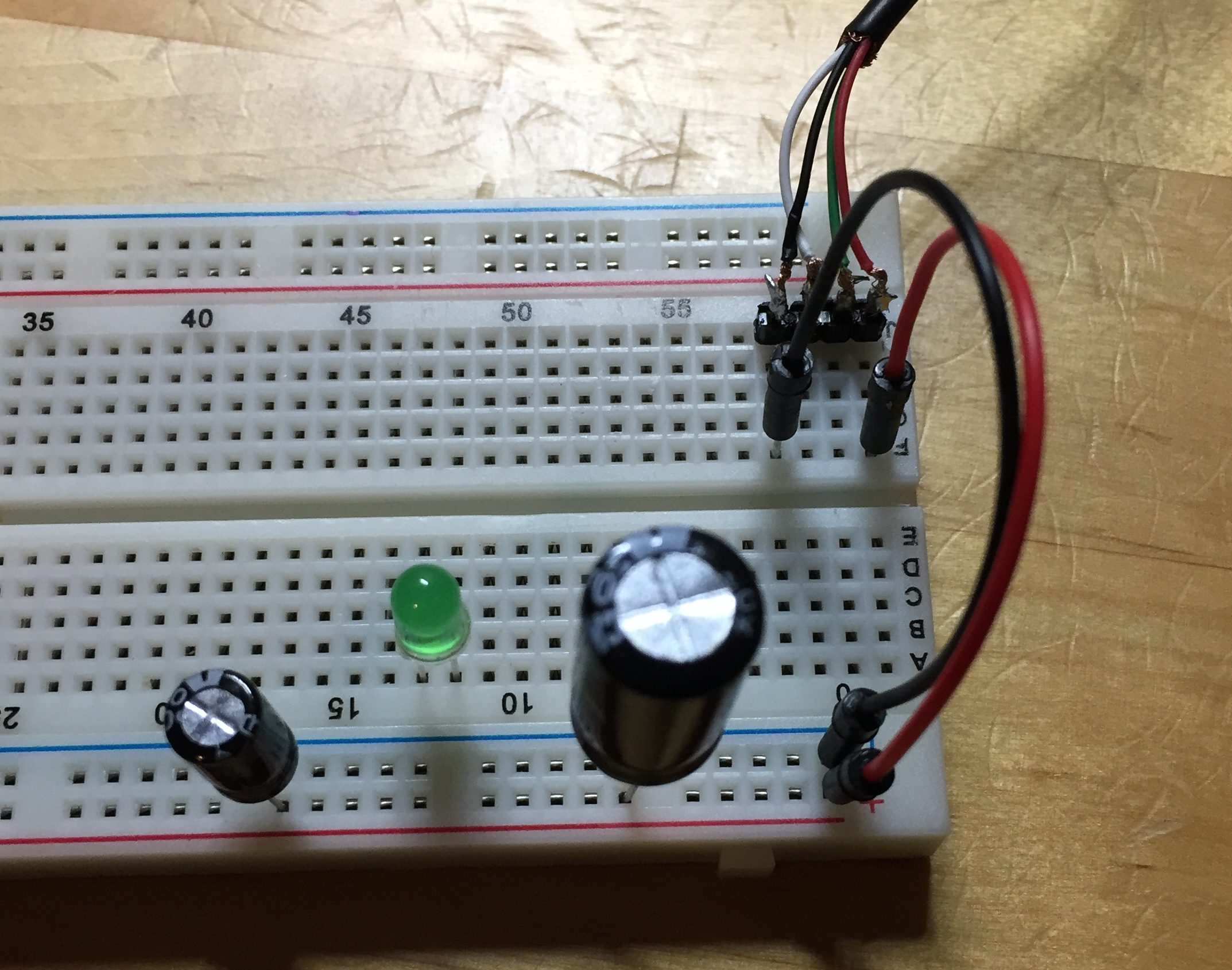 This photo was taken right after we connected the power supply. While it’s hard to see, the capacitor is in series with the LED. Power coming from the power rail goes into the positive side of the capacitor and the negative side of the capacitor connects to the LED’s positive lead. If we look at this circuit after about 10 seconds we see this…