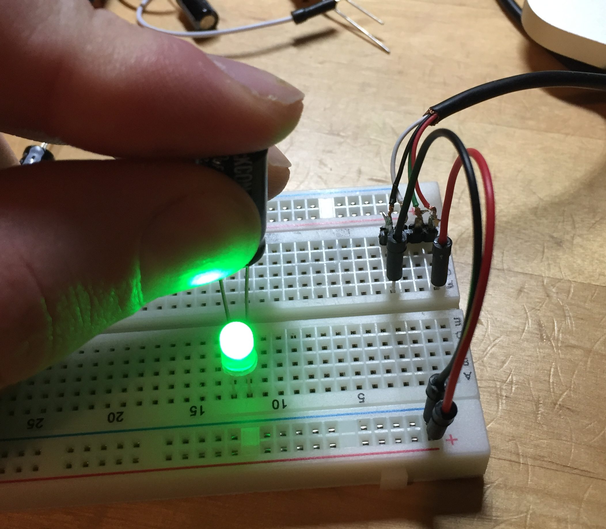 Note: You’ll notice here that I don’t have a resistor inline with the LED. This is a great way to burn out LEDs. I quickly realized my mistake after burning out two here. I just wasn’t thinking when I started doing these labs.
