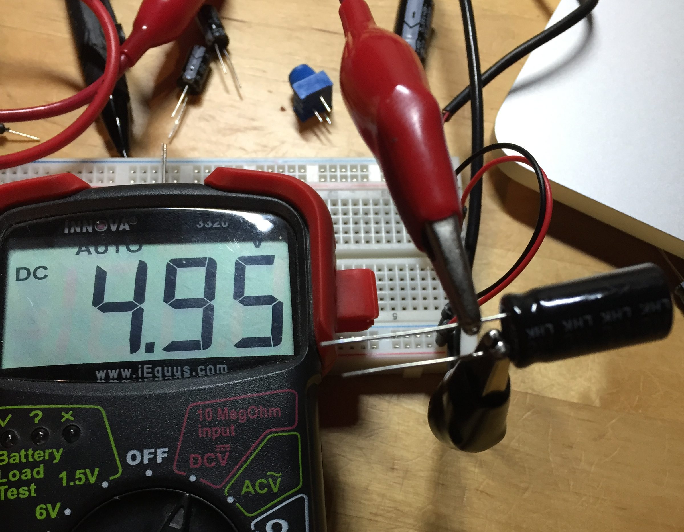 So above you can see the circuit with the power supply connected. One of our capacitors is showing almost 5 volts to match the power supply. Now if we pull the power we’ll start to see the voltage slowly drop…