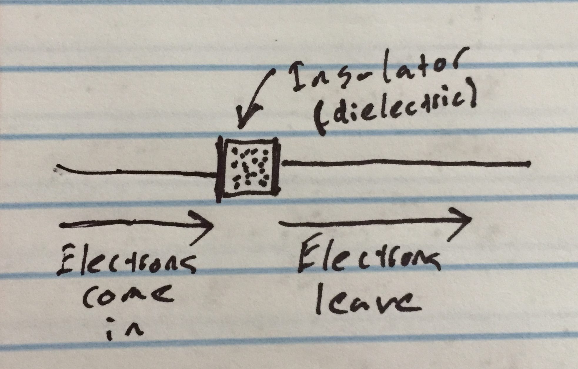 A capacitor is essentially two metal plates separated by what’s called a ‘dielectric’. As you apply charge to a capacitor electrons are forced into one side of the capacitor. As they enter, they repel the electrons on the other metal plate. This leaves behind positively charged particles which are trying to attract the electrons through the dielectric on the first plate. To summarize, the plate on the left develops a surplus amount of electrons. However – the capacitor can only hold so much charge. This is what we saw above where the capacitor showed that it was able to hold the same amount of voltage as the power supply we charged it with. When we connected the LED to the capacitor the excess electrons move back to the other plate through the LED releasing the charge.