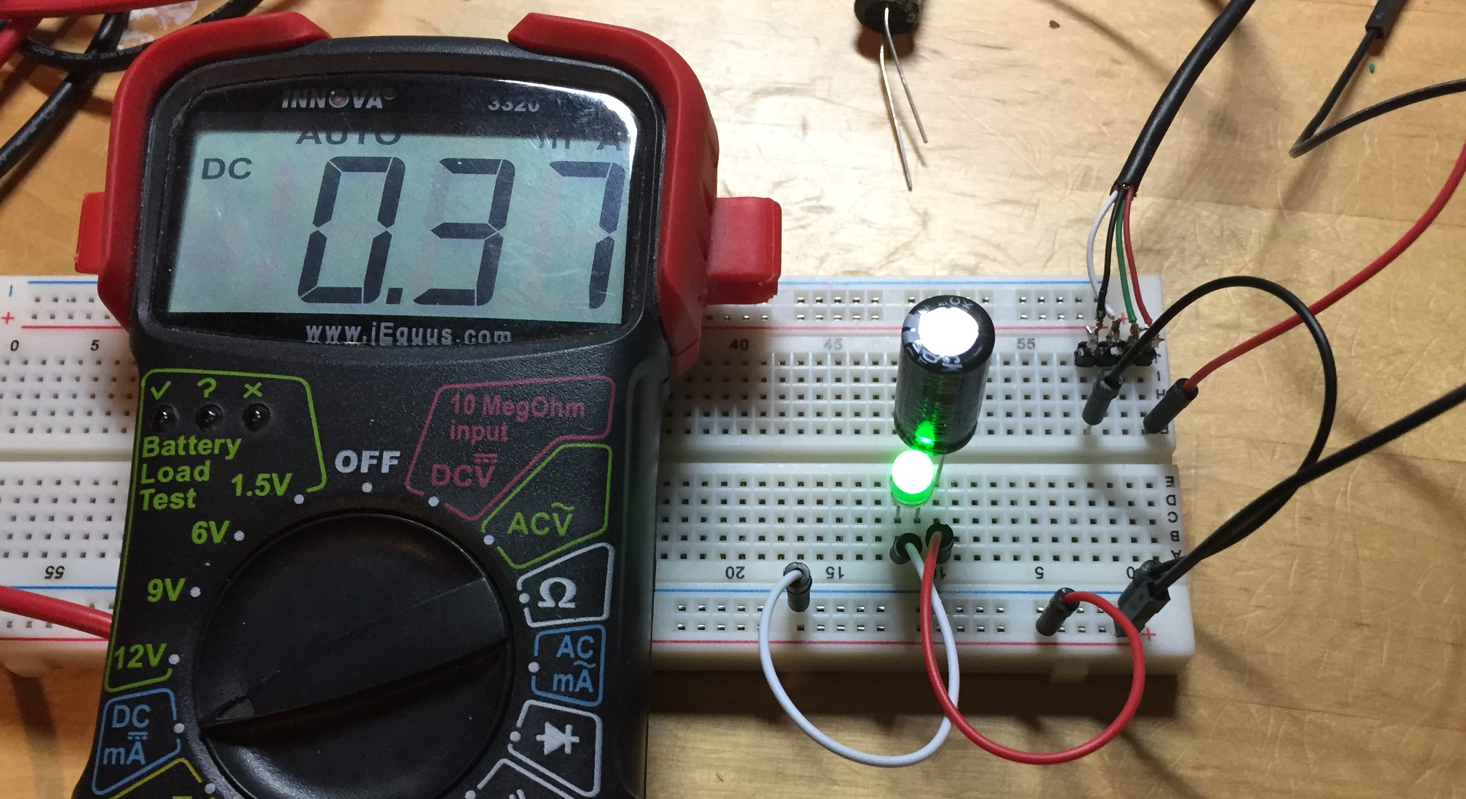 Hey, light! So the capacitor is storing some kind of charge that allows the LED to turn on when they are connected in a circuit. The longer the capacitor is plugged in – the dimmer the LED will get as the light discharges. If we want to see whats happening, we can charge up a capacitor and then check it’s voltage…