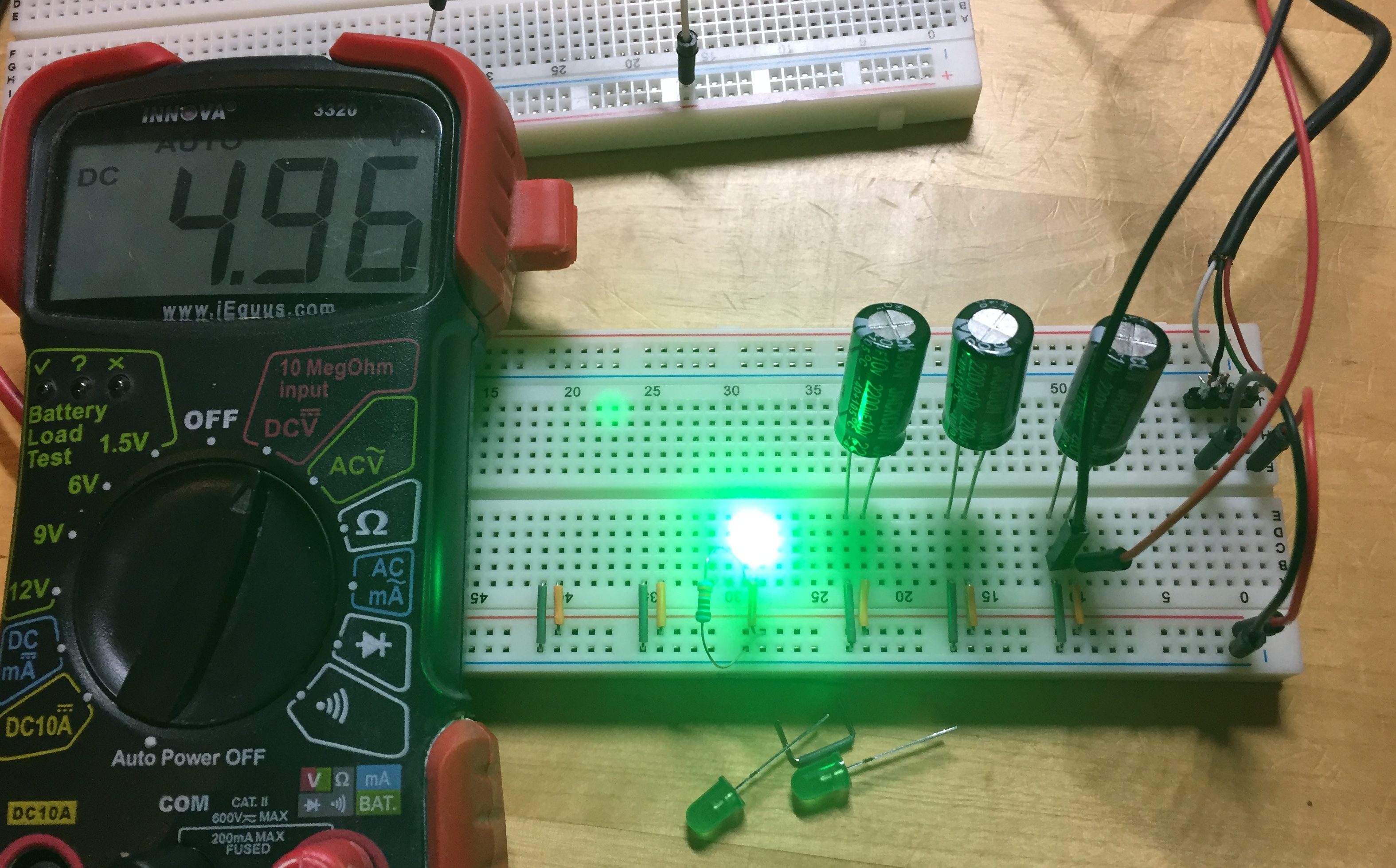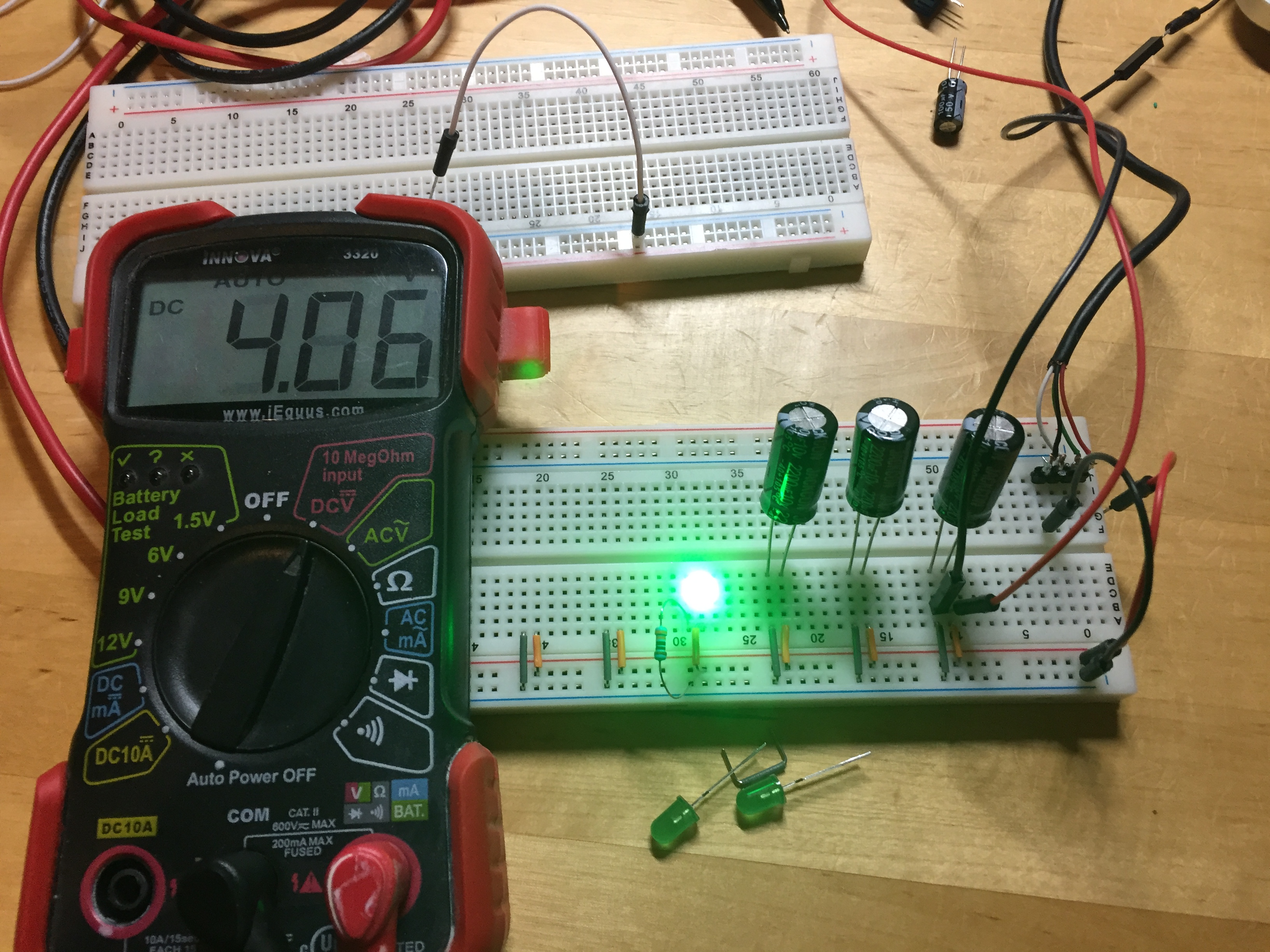 Here we have the breadboard I have setup for parallel circuits. On one branch I have the LED and 3 other branches I have capacitors. With the power plugged in the LED stays lit brightly and the capacitors charge and then stop passing current. I was measuring current in the example above but a more interesting example is to check the voltage of a capacitor with and without power…