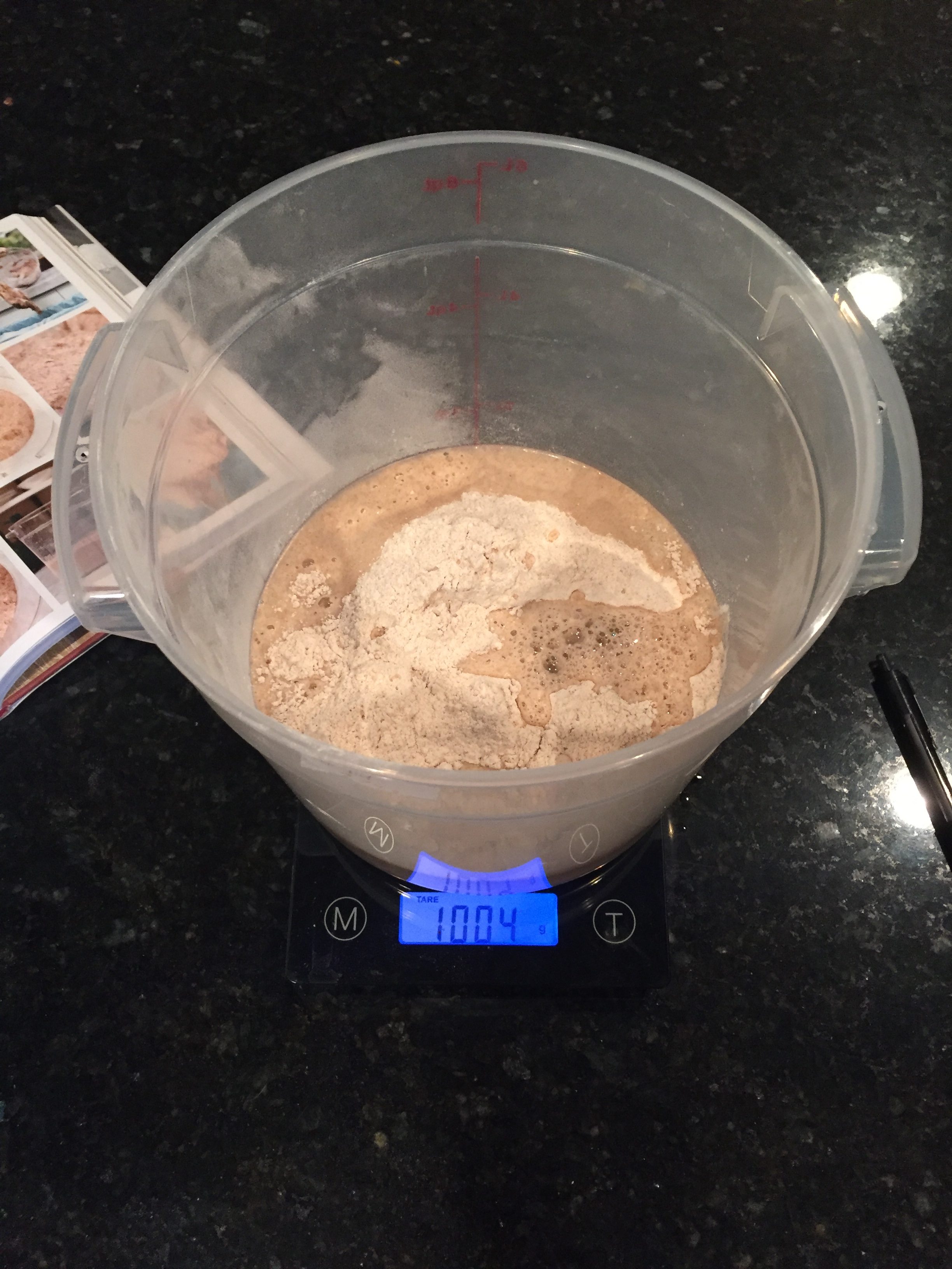 After my first failed attempt at making a starter I thought I’d try again. Once again – Im taking the recipe from the second book I bought. It seems to be more straight forward in terms of listing actual measurements rather than relying on ‘feel’ for consistency and other things. I started it this morning and am hoping it turns out better than my first attempt. The first thing I did, was weigh my container so I know how much it weighs empty. This will be important for later steps when we add more ingredients.