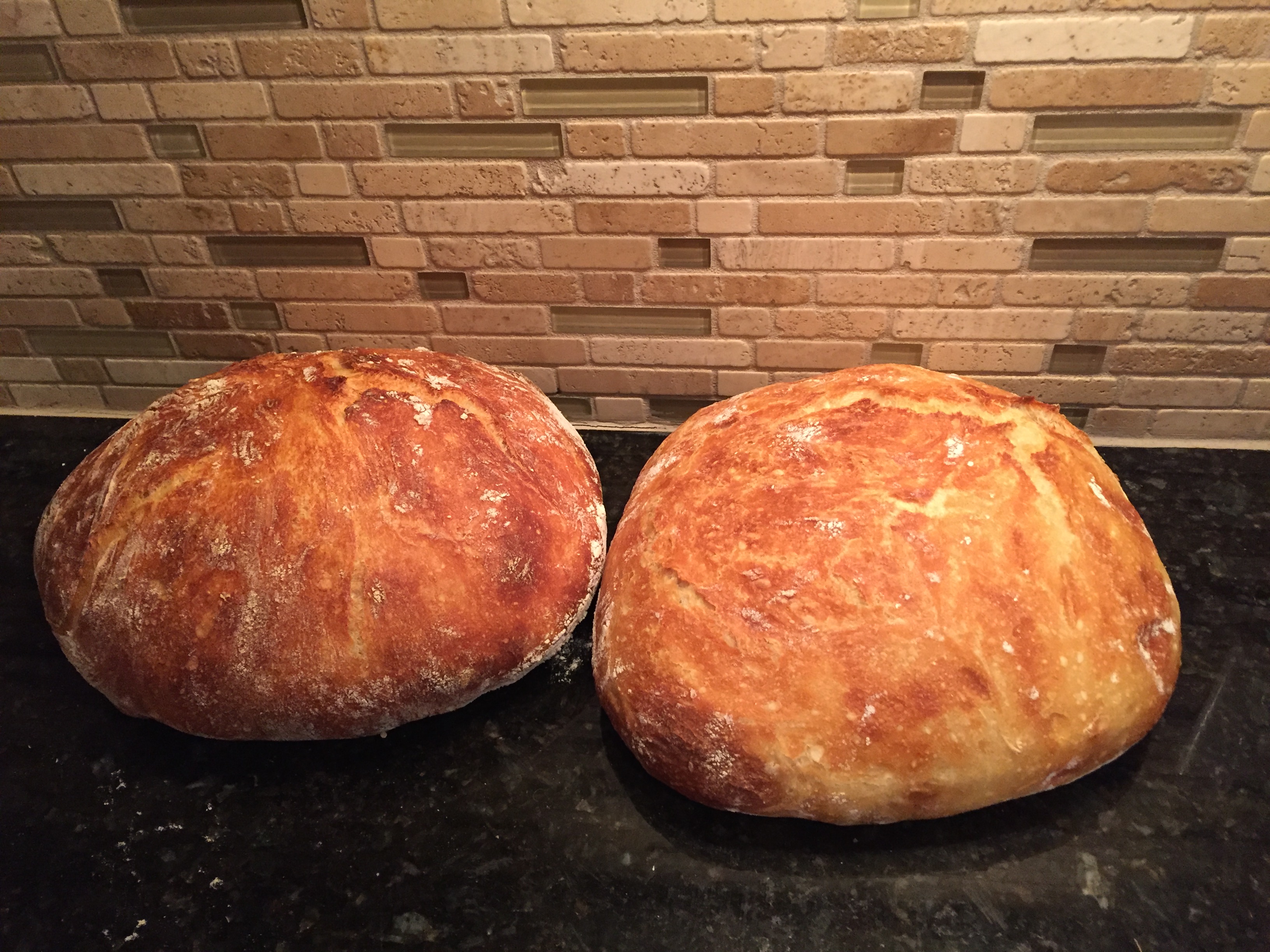 Returning from a week long vacation I was anxious to try my hand at baking bread again. I was a little suspicious that I might have just lucked out and ended up with a miracle loaf the first time around. This time I made the recipe as stated which created two loaves. The first one (the one on the right) I think I took out too early but both turned out really well and tasted great! I shared the second loaf with a neighbor and they seemed to think it was good to so I think Im doing OK. Im anxious to experiment with this recipe some more.
