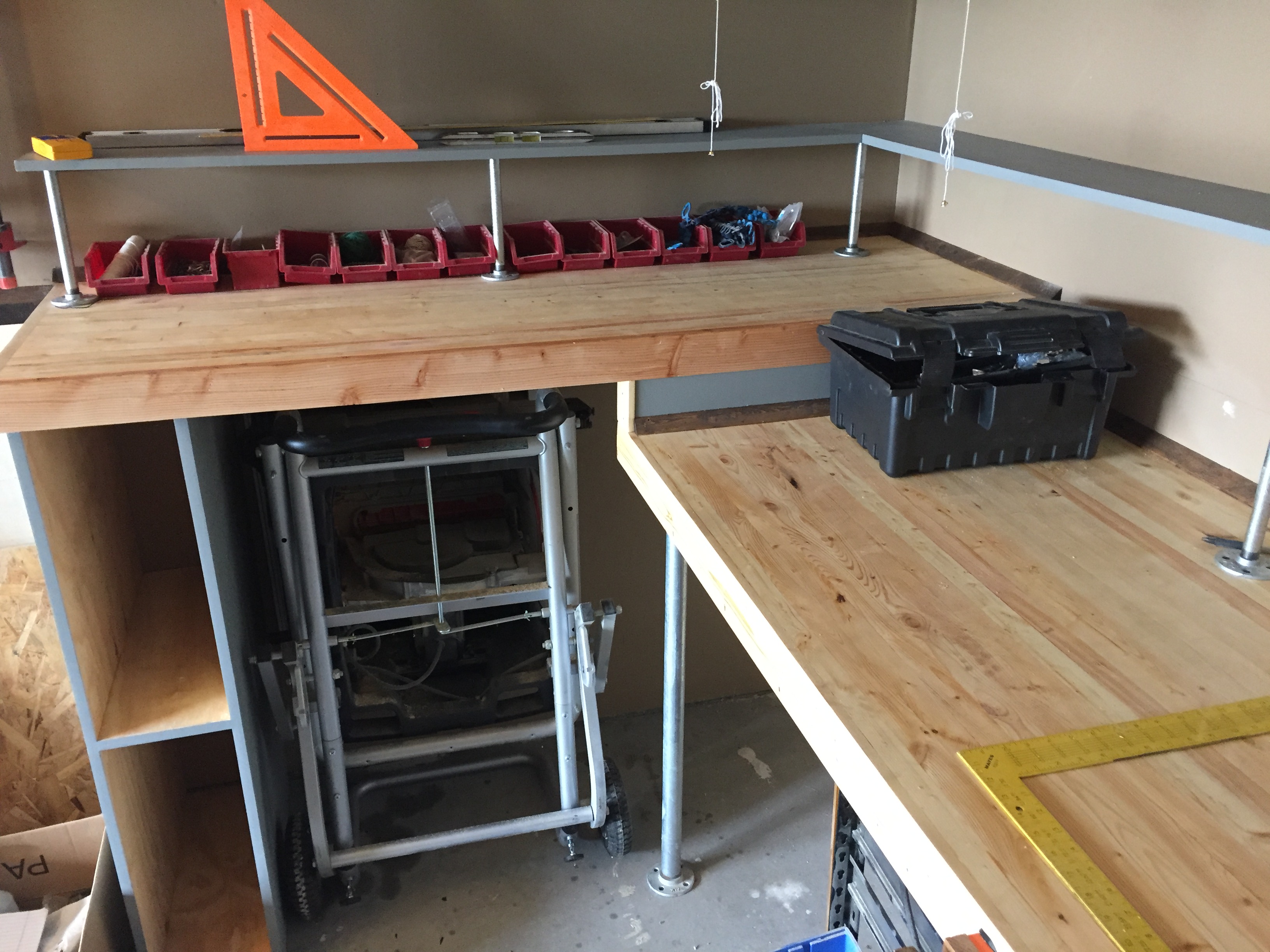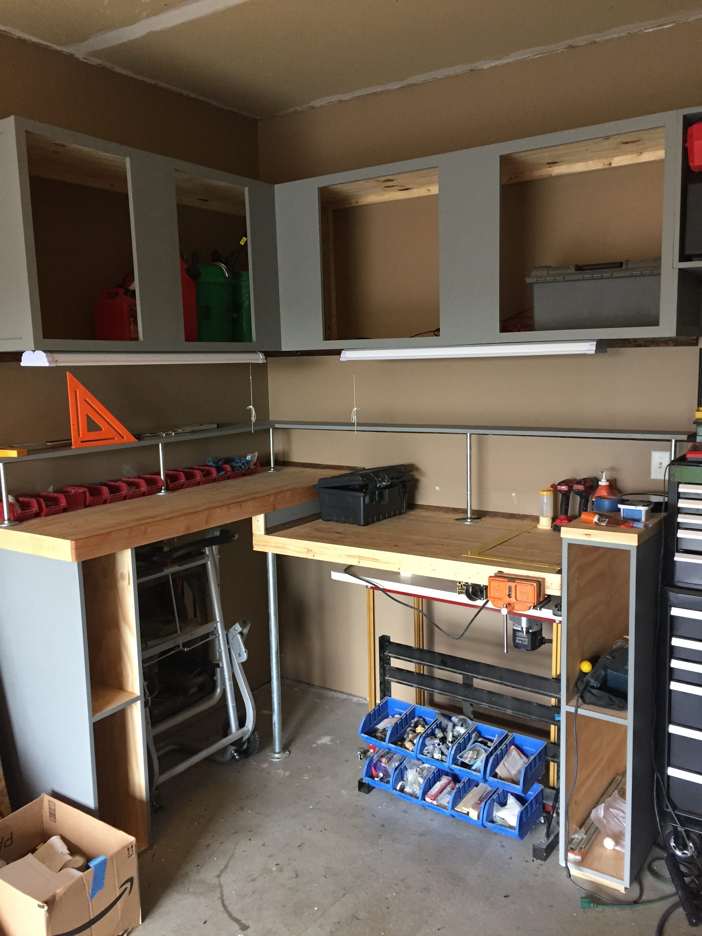 Well – I’ve been noticeably gone from here for awhile. I dont even want to look and see when the last post was. At any rate, I have some garage progress to report. Namely, I’m done will all of the built in cabinets with the exception of the doors and drawers! The last area I had to work on was my work bench and I literally just finished that up. Looks like this…