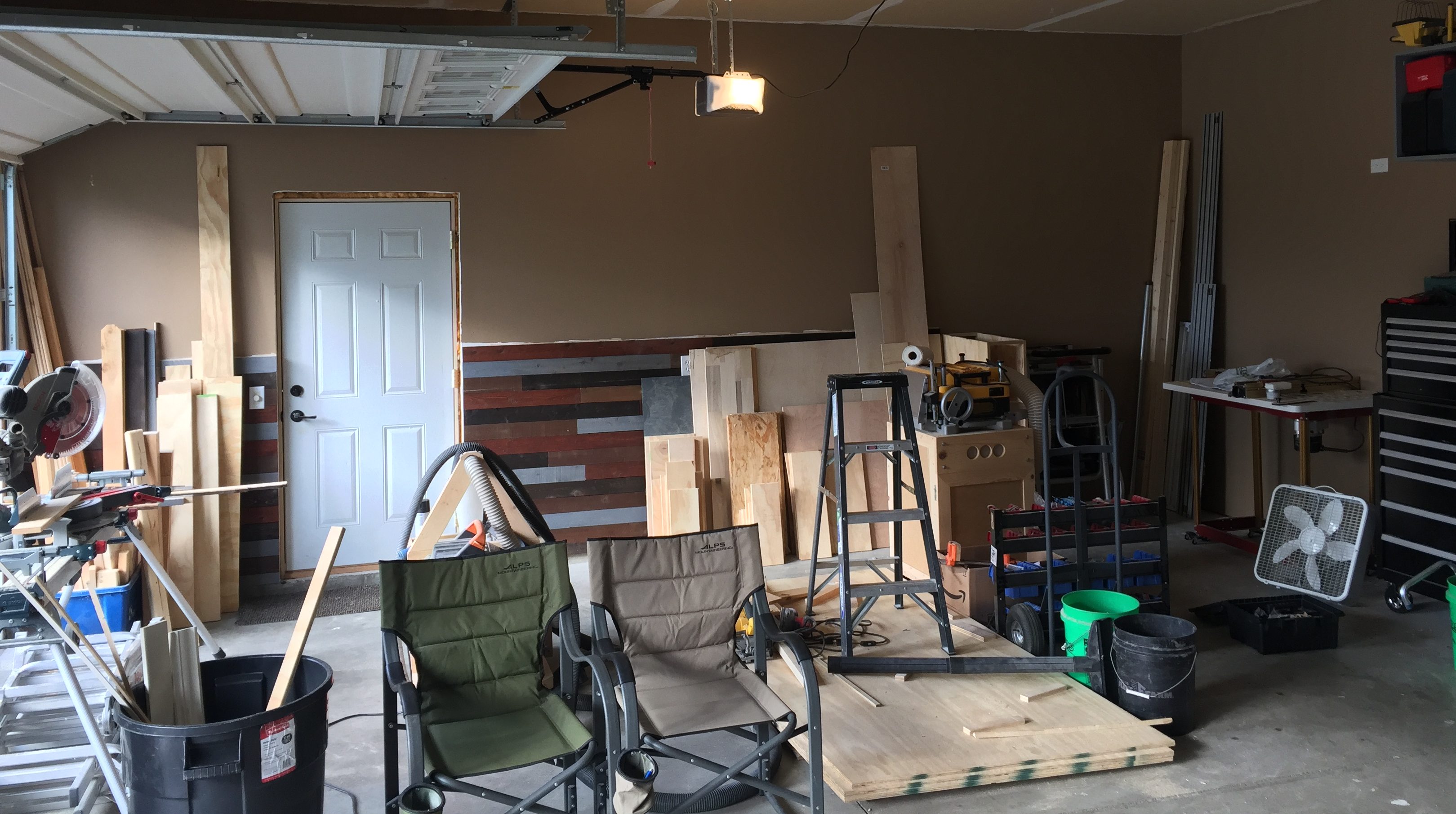 Its hard to see here since I moved a bunch of wood around again but the wall is totally paneled and above it and where my work bench will be (right side) is painted. The only walls left to be painted this point are above the garage doors and I can easily work on that once the other pieces are done. The ceiling still needs to be done but that’s going to come much later on. Next step is to finish my work bench which should clear up a ton of floor space since all the plywood will be gone. We’re getting close!